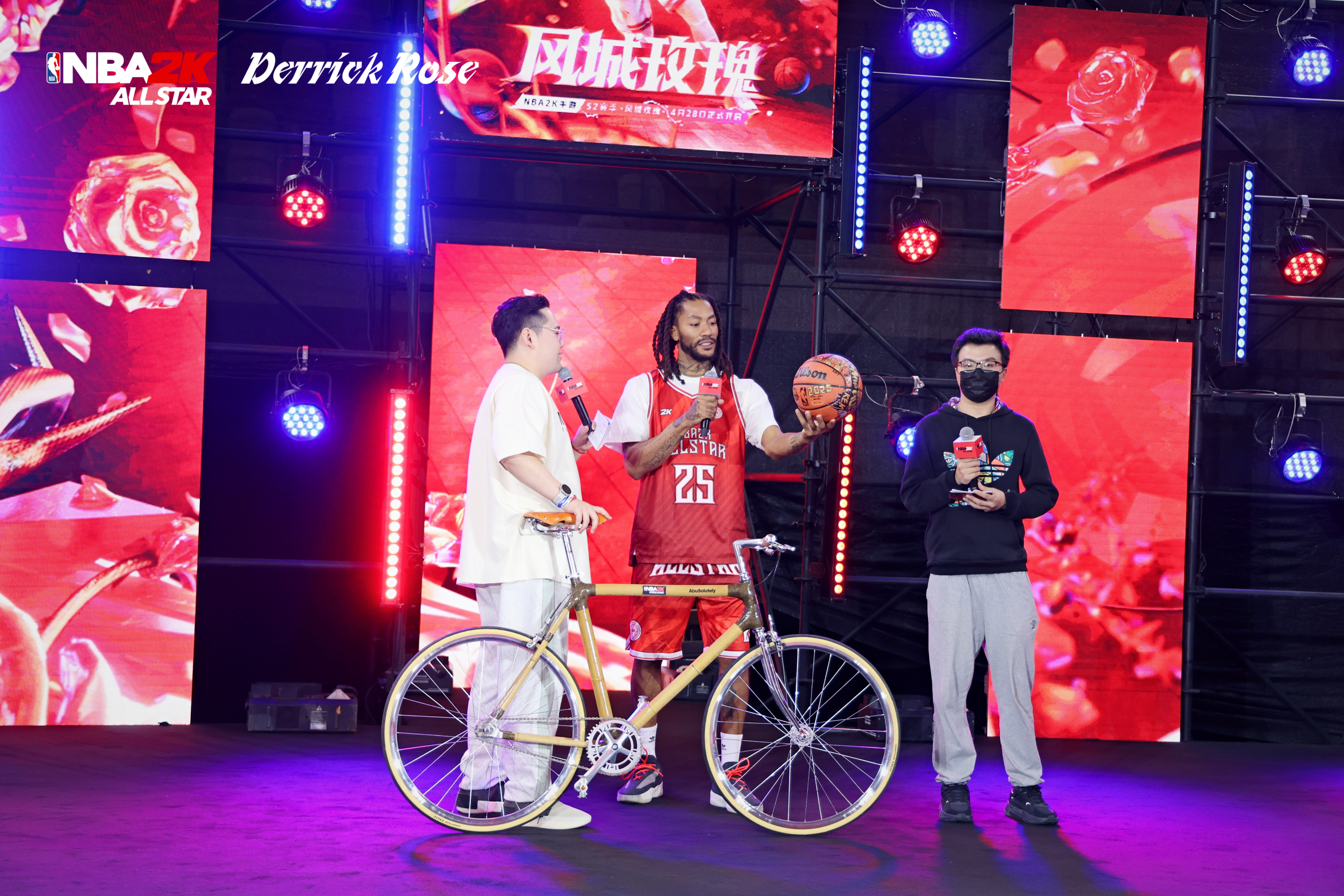 罗斯远道而来,NBA2K手游也为罗斯准备了一份礼物——一辆自行车和手绘篮球,罗斯骑上后兴奋绕舞台一周,看得出来是很喜欢了。